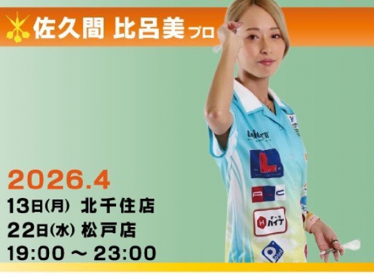 Link所属プロによるプレイヤーDay! 4月22日(水)19:00~23:00 JAPAN所属 佐久間比呂美プロ来店! 特別な参加費は無しで、プロと一緒にダーツを練習! ・ダーツを上達したい! ・コツを知りたい! ・一緒に練習したい! ・プロに会ってみたい! ・ダーツの仲間が欲しい! 初心者の方やビギナーの方はもちろん! マイダーツを持ってなくても、カードを持ってなくても参加OK! Link所属の優しいプロの皆さんと、是非一緒にダーツしてみませんか? ダーツ、ビリヤード、卓球、スポーツ観戦! 松戸で遊ぶなら是非当店へ! 松戸駅東口から徒歩30秒! 駅からのアクセスも良い当店でお待ちしております!